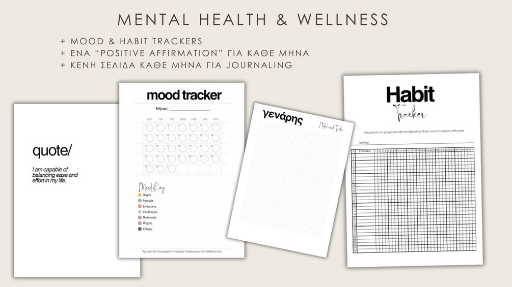 - Ημερίσια Ατζέντα με χώρο για στόχους ημέρας, πρόγραμμα, καταγραφή διατροφής & άσκησης κ.α.