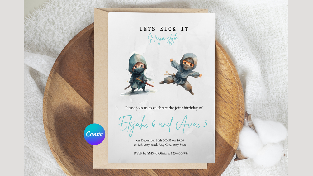 Throw an unforgettable Ninja-themed joint birthday party with this bold and fun editable invitation! Designed for two birthday celebrants, this template is perfect for siblings, twins, or friends sharing the big day.